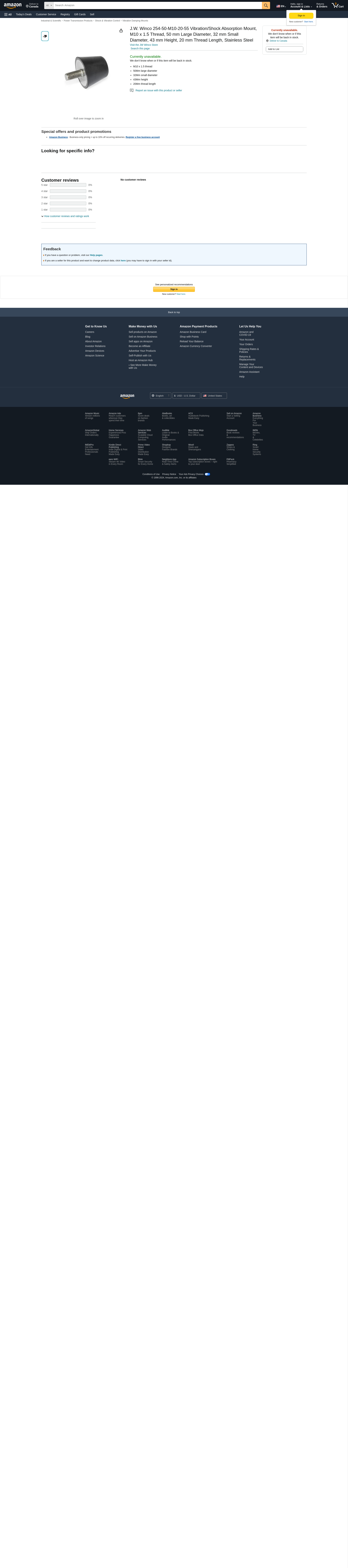 J.W. Winco 254-50-M10-20-55 Vibration/Shock Absorption Mount, M10 x 1.5 Thread, 50 mm Large Diameter, 32 mm Small Diameter, 43 mm Height, 20 mm Thread Length, Stainless Steel