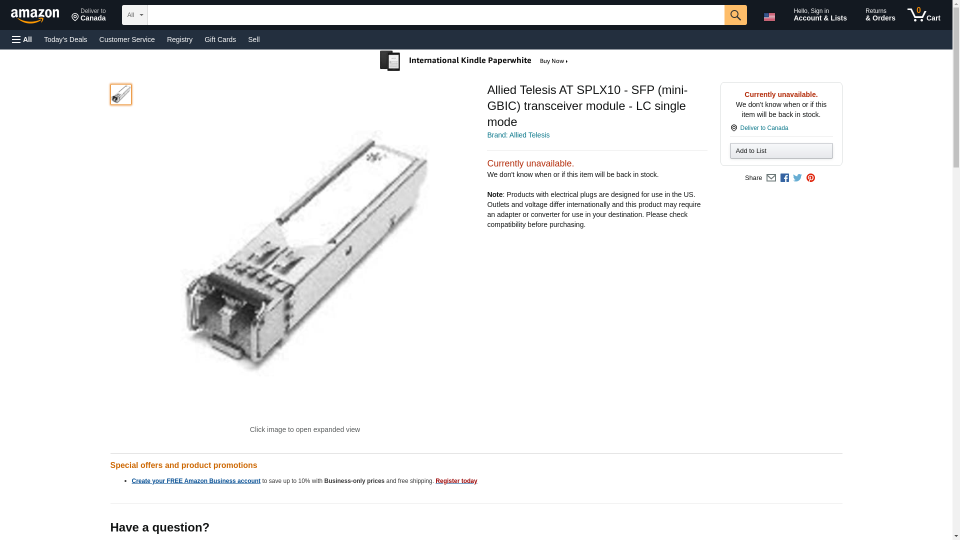 The AT-SP series offers the latest industry standard in flexible full-duplex Gigabit Ether connectivity. These hot-swappable fiber interfaces simply plug into a SFP slot on SFP patible products. Configurations can be optimized to meet varied distance and service requirements.Primary InformationNetworking Type : Transceiver module Form Factor : Plug-in module Networking Interface : SFP (mini-GBIC) Data Transfer Rate : 1 Gbps Data Link Protocol : Gigabit Ether Connectivity Technology : Wired Cabling Type : Ether 1000Base-LX ExpansionService&SupportService & Support Type : 2 years warranty UNSPSC CodeUNSPSC Code : 43222608