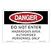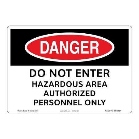 <p><strong>Word Message: </strong><br />DO NOT ENTER - HAZARDOUS AREA AUTHORIZED PERSONNEL ONLY</p><p><strong>Description: </strong><br />Clarion Safety Systems brings you Danger Do Not Enter-Hazardous Area Authorized Personnel Only safety signs (OS1125DH-) which are produced on premium plastic or aluminum material and are designed to meet your OSHA safety sign needs.<p><strong>Material Information:</strong></p> <ul> <li><strong>Material</strong>: (S2) Outdoor Weather Tuff Plastic</li> <li><strong>Base Materials</strong>: .060" Rigid White Plastic</li> <li><strong>Overlaminate</strong>: 3M .003 Ultra-Clear WeatherTuff UV resistant</li> <li><strong>Mounting Option</strong>: Mounting holes</li> <li><strong>Application</strong>: Indoor/Outdoor</li> <li><strong>MaxTemp</strong> (F): 140</li> <li><strong>MinTemp</strong> (F): 32</li> <li><strong>Chemical Resistance</strong>: Excellent</li> <li><strong>UV Resistance</strong>: Excellent</li> <li><strong>Outdoor durability</strong>: Excellent</li> <li><strong>Storage Stability</strong>: Stable. Optimum storage conditions: 72 F @ 50% relative humidity</li> <li><strong>Expected Life Indoor</strong>: Long term</li> <li><strong>Expected Life Outdoor</strong>: 5 - 10 years (expected outdoor life may vary due to climatic conditions)</li> <li><strong>RoHS</strong>: No</li> <li><strong>CRoHS</strong>: No</li> <li><strong>REACH</strong>: No</li> </ul>