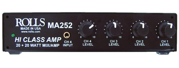 The new MA252 is a compact class D stereo amplifier with a 4 CH. stereo mixer built in. It has 20 watts per channel @ 4 Ohms. The class D low heat design gives the MA252 the ability to be mounted in very tight applications. It will work great in ceilings by projectors, or anywhere small and heat free amplification is required. The MA252 is in an all metal chassis and weighs 1 pound. Overall dimension are 6.75" X 3.5" X 1.5". Bottom mounts are provided for permanent installations. The MA252 has an included 24 VDC external power supply. The 4 channel mixer section consists of 2 separate RCA stereo inputs, along with an XLR mic input and a 3.5mm (1/8") stereo input perfect for an ipod or laptop computer type input. Phantom power is supplied to the XLR input by a switch on the back of the MA252.</p>