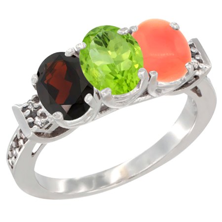10K White Gold Natural Garnet, Peridot & Coral Ring 3-Stone Oval 7x5 mm Diamond Accent, sizes 5 - 10