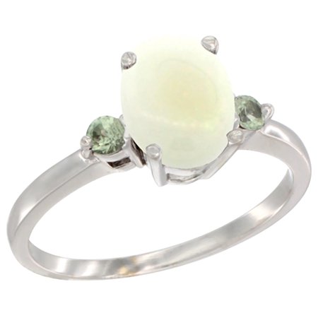 14K White Gold Natural Opal Ring Oval 9x7 mm Green Sapphire Accent, sizes 5 to 10