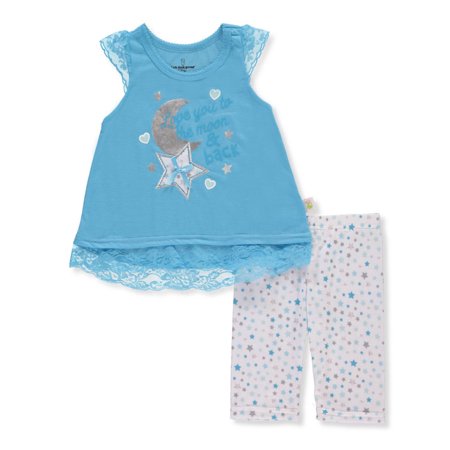 <ul> <li>Duck Duck Goose 2-piece pajama set</li> <li>Poly jersey T-shirt with flared hem, picot trim, embroidered chest graphic, lace trim, lace flutter sleeves, and tagless neckline interior (100% polyester)</li> <li>Printed poly jersey shorts with elastic waistband (95% polyester, 5% spandex)</li> <li>Flame resistant</li> <li>Machine wash cold</li> </ul>