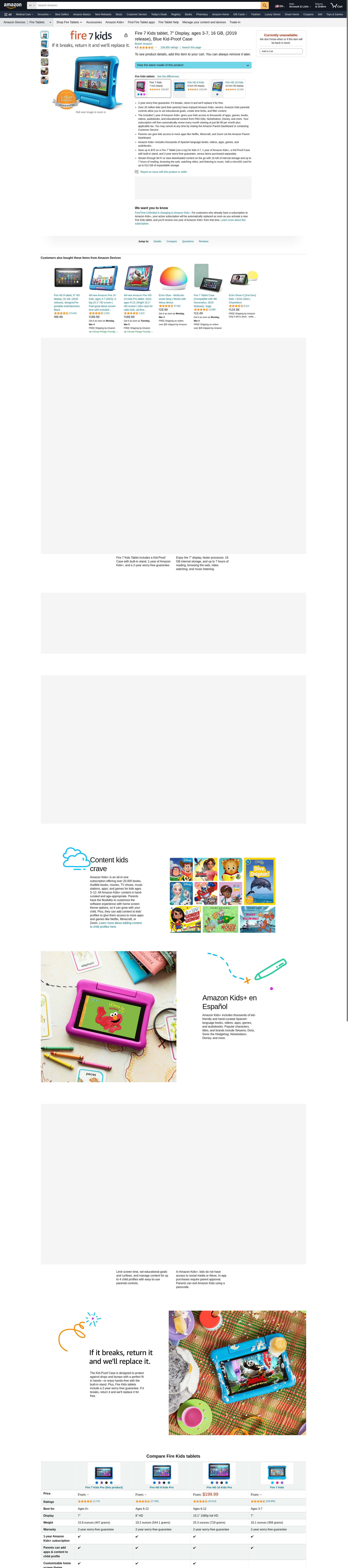 Fire 7 Kids tablet, 7" Display, ages 3-7, 16 GB, (2019 release), Blue Kid-Proof Case