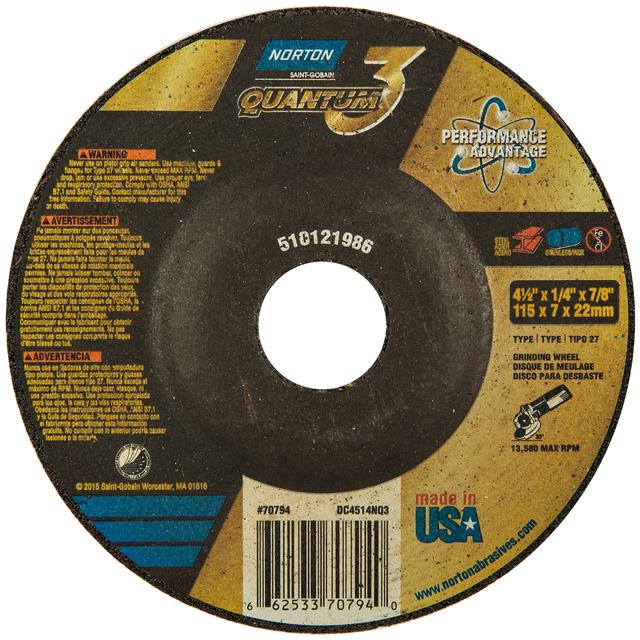 | Feature | <b>Price For:</b> Each <b>Wheel Type</b>: Grinding <b>Abrasive Material</b>: Ceramic <b>Thickness</b>: 1/4" <b>Item</b>: Depressed Center Wheel <b>Type</b>: Type 27 <b>Grade</b>: Extra Coarse <b>Grit</b>: 20 <b>Diameter</b>: 4-1/2" <b>Arbor Size</b>: 7/8" <b>Series</b>: Quantum 3 <b>Max. RPM</b>: 13, 580 <b>Country of Origin (subject to change)</b>: United States |