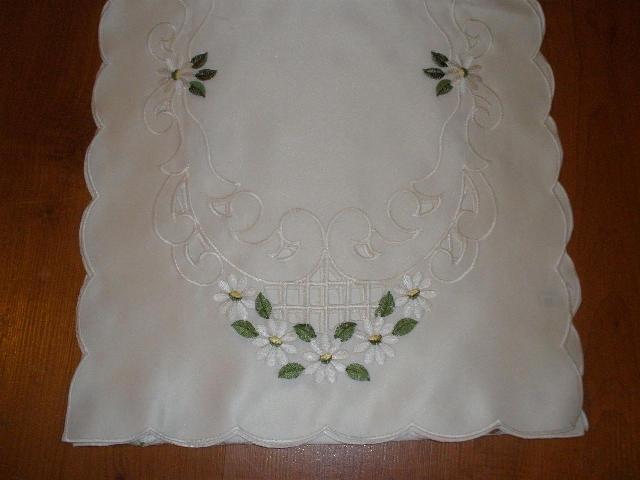 - Embroidered daisies and lacy cut work table runner