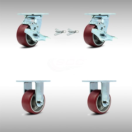 Stainless Steel Polyurethane on Aluminum Swivel Top Plate Caster Set 4 w/4" x 2" Maroon Wheels-Includes 2 Swivel w/Brakes and Bolt on Swivel Locks & 2 Rigid-2800lbs Total Capacity-Service Caster Brand