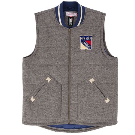 Show your style in this "Victory" throwback vest jacket from Mitchell & Ness. Features left chest applique team logo with embroidered details, polyester taffeta and polyfill quilted lining, quilting on heathered front & back body, front patch welt pockets with felt tabs, front antique brass metal zipper, ribbed trim at collar, 100% polyester, and Mitchell & Ness script embroidery on the back yoke. Officially licensed. Tailored fit to fit a bit trimmer in the body.
