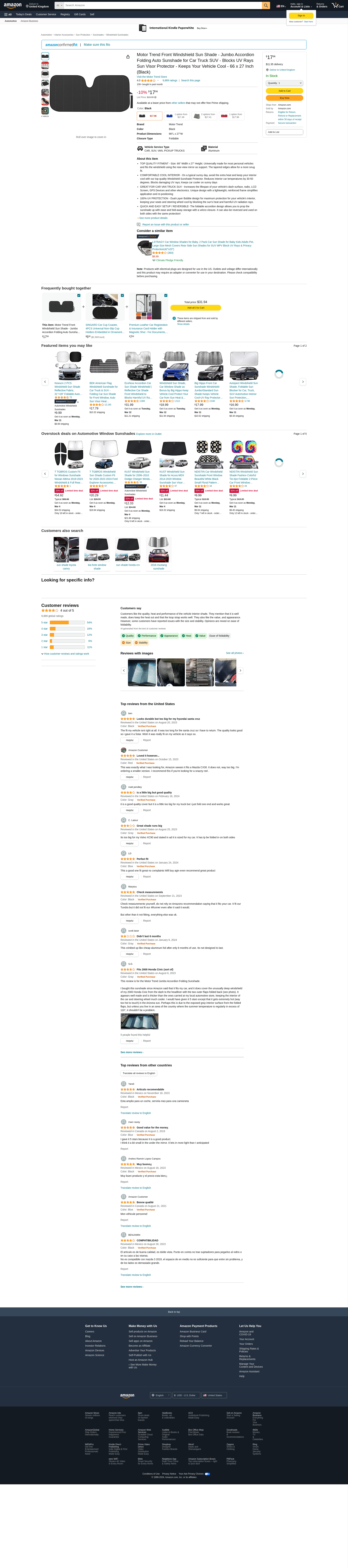 Motor Trend Front Windshield Sun Shade - Jumbo Accordion Folding Auto Sunshade for Car Truck SUV - Blocks UV Rays Sun Visor Protector - Keeps Your Vehicle Cool - 66 x 27 Inch (Black)