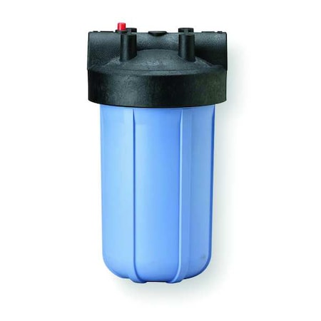 'Water Filter System, Microns 25, Flow Rate 10 gpm, Max. Pressure 100 psi, Pressure Drop 4 psi, Service Life 35,000 gal., Without Gauge, Overall Height 13-1/8 In., Overall Width 7-1/4 In., Max. Temp. 100 Degrees F, Number of Cartridges Required 1, Cartridges Required 4-1/2 In. x 9-3/4 In. Cartridges, Connection 1 In. NPT, Color Blue and Black, Sediment, Chlorine Taste and Odor Reduces, Head Material Polypropylene, Housing Material Polypropylene, Standards NSF 42'