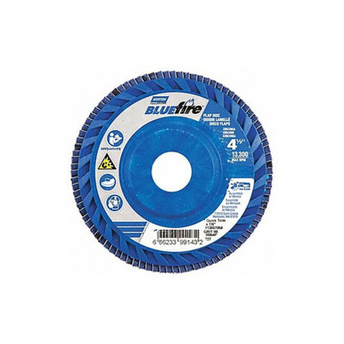 ' Flap Disc, Disc Type Type 27, Disc Dia. 4-1/2 In., Grit 80, Abrasive Type Coated, Grade Medium, Mounting Size 7/8 In., Abrasive Material Zirconia Alumina, Series Bluefire, Backing Material Plastic, Backing Weight Y, Max. RPM 13, 300 '