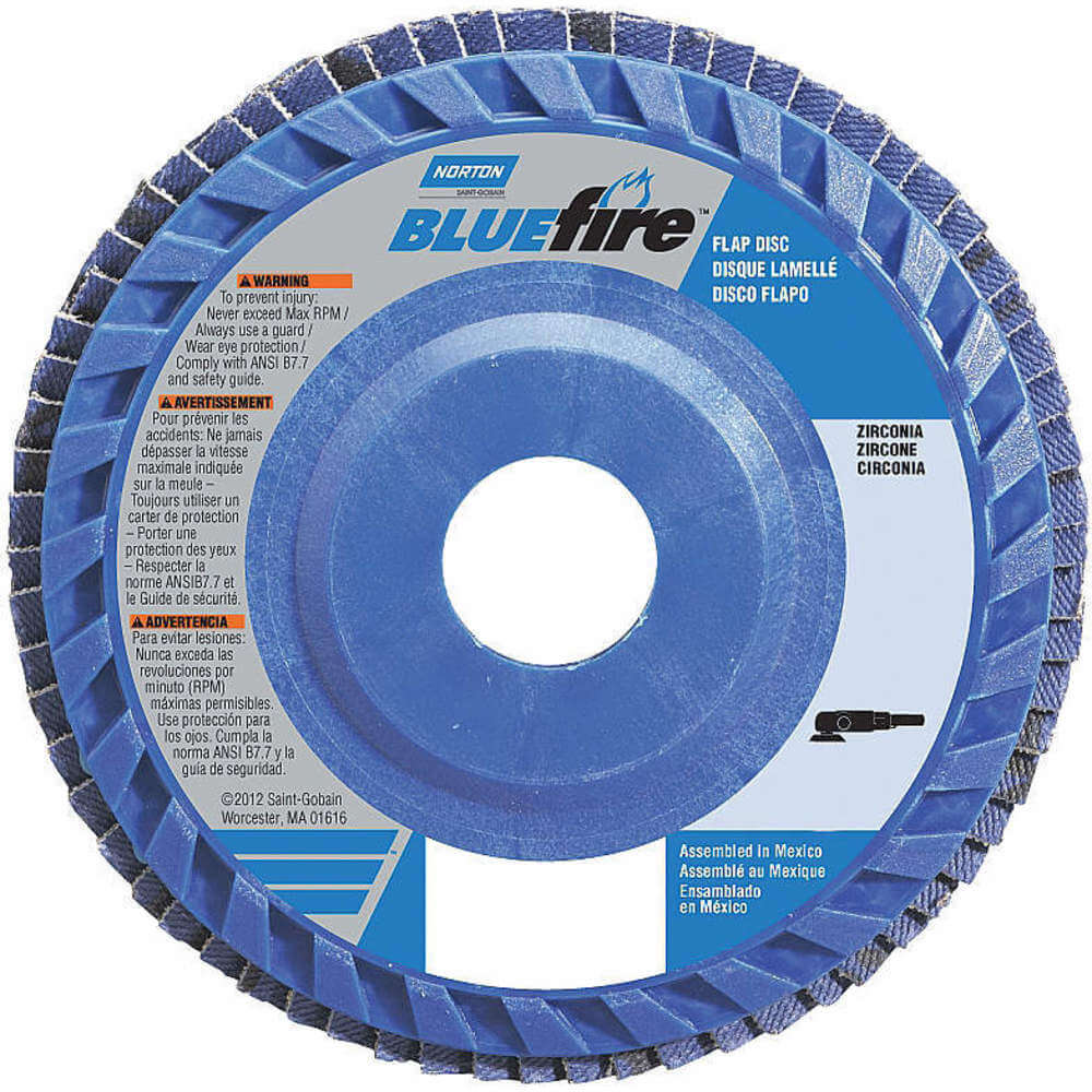 Norton; BlueFire; Coated Flap Disc, Quick Trim Standard Density, Series: R884P, 4-1/2 in Dia, 7/8 in, 80/Medium, Zirconia Alumina Plus Abrasive, Type 27/Flat, Fiberglass/Plastic Backing, Applicable Materials: Mild Carbon Steel and Welds