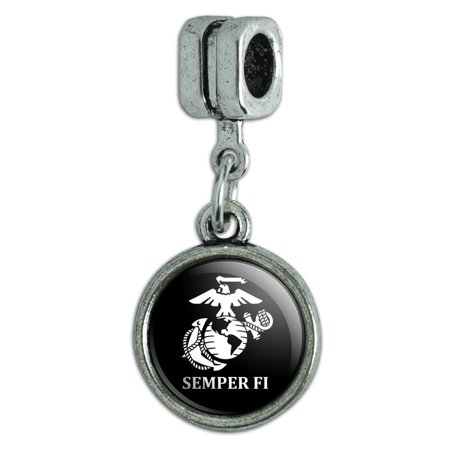 <ul> <li>Accessorize your European style charm bracelet with this fun and seriously cool antiqued charm.</li> <li>The charm dangles from the attached metal bead that can easily be added to your bracelet. It includes the resin-topped design on both sides of the charm.</li> <li>Made of metal. Approximate size of charm is 0.6" (15mm) in length.</li> <li>An officially licensed product of the United States Marine Corps.</li> <li>A Graphics and More product.</li> </ul>