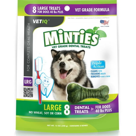 <b>Minties from VetIQ Large Dog Dental Treats, 12 oz:</b> <ul> <li>Clean teeth</li> <li>Promote fresh breath</li> <li>Remove plaque and tartar</li> <li>Free of wheat, gluten, soy and corn</li> <li>No artificial flavors or animal by-products</li> <li>Vet Grade Quality</li> <li>Made for dogs 40 lbs and up</li> </ul>
