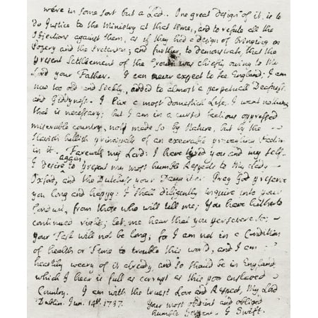 Part of a letter dated 14 June 1737 from Jonathan Swift to Robert Walpole 2nd Earl of Orford. Jonathan Swift 1667 was reproduced on the finest Canvas which captures all of the vivid colors and details of the original art. This museum quality Canvas Art was faithfully reproduced using ultra-precision print technology and fade-resistant archival inks on artist premium acid-free grade canvas. The overall size is 24 x 30 inches plus an additonal 1.5 inches of extra canvas on all 4 sides to allow for easy stretching and/or framing. This premium rolled Canvas Art is ready for stretcher bars or custom framing. <br /> <br /> <ul> <li>Brand New and Rolled and ready to stretch or frame</li> <li>Canvas Art Title: Part of a letter dated 14 June 1737 from Jonathan Swift to Robert Walpole 2nd Earl of Orford. Jonathan Swift 1667</li> <li>Canvas Size: 24.00 x 30.00 inches plus an additional 1.5 inches of extra canvas on all 4 sides to allow for easy stretching and/or framing</li> <li>Licensor: Design Pics</li> <li>Artist: Ken Welsh / Design Pics</li> </ul>