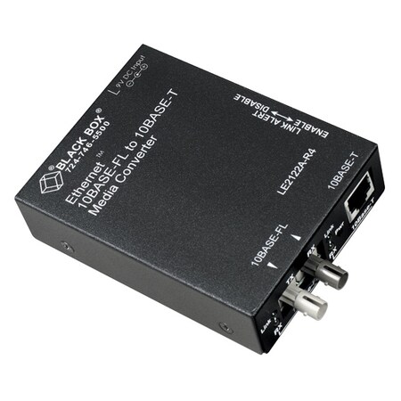 BlackBox, LE2122A-R4, AutoCross 10BASE-T to Duplex 10BASE-FL 1-Port Media Converter w/ ST AutoCross Media Converter, 10BASE-T to Duplex 10BASE-FL, Multimode ST, 1-Port. Forget DCE/DTE worries! AutoCross adapts without any input from you! Quick Facts Seamless copper-to-fiber conversion for Ethernet or Fast Ethernet. Easy plug-and-play operation. Reconfigures itself for proper UTP cabling-no more crossover cables! Support for half- and full-duplex operation. Guaranteed for life! Further Details Uplink/downlink fault detection is provided by LinkAlert. Autosensing port configuration. Full- and half-duplex operation. Universal, autosensing power supply. Connect Ethernet segments to fiber segments without using crossover cables. With a Black Box AutoCross Media Converter, you no longer have to deal with mismatched transmit and receive cable pairs. This converter contains a switch that senses the type of circuit connected to the UTP port and automatically configures the port to match. Because the UTP side is autosensing to MDI/MDI-X, you can use either a straight or crossed cable to connect a switch or NIC. The converter features LinkAlert, which monitors 100% of physical uplink and downlink failures and alerts the network if transmission fails. This Ethernet version of the AutoCross Media converter is not compatible with autosensing devices (for example, a 10-/100-Mbps hub); it only works with standard 10-Mbps devices. Use the AutoCross Media Converter up to 100 meters (328 ft.) on the UTP link and up to 2 kilometers (1.2 mi.) on a multimode fiber link.