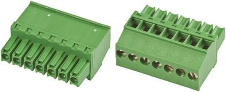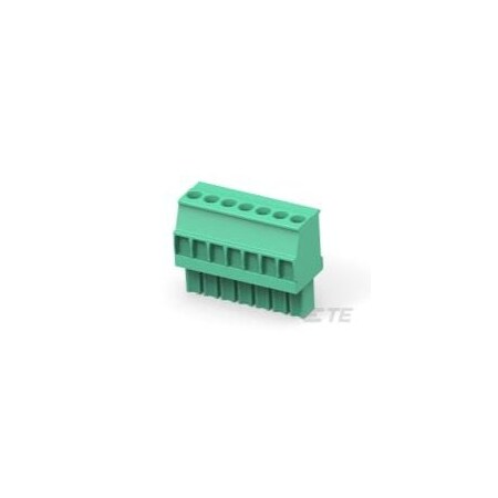 EU RoHS: Compliant with Exemption ECCN (US): EAR99 Part Status: Active HTS: 8536.69.40.40 Type: Eurostyle Block Gender: F Number of Contacts: 7 Terminal Pitch (mm): 3.5 Number of Rows: 1 Number of Circuits: 7 Termination Method: Screw Body Orientation: Straight Maximum Current Rating (A): 11/Contact Maximum Voltage Rating: 300VAC Minimum Operating Temperature (°C): -40 Maximum Operating Temperature (°C): 110 Product Length (mm): 24.5 Product Depth (mm): 10.35 Product Height (mm): 19.2 Housing Color: Green Mounting: Cable Mount