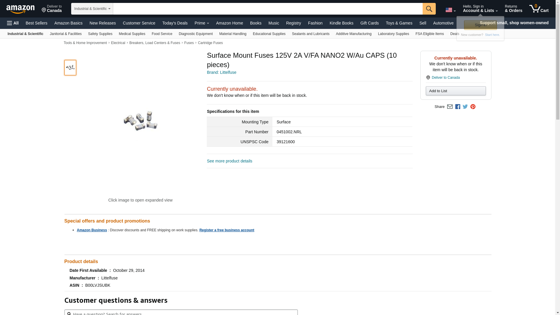 0451002.NRL, Fuse Chip Very Fast Acting 2A 125V SMD Solder Pad 2410 Ceramic T/R CE/CSA/PSE/UL (25 items)