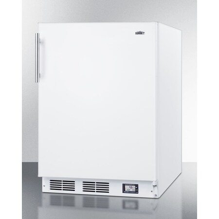 Summit Appliance BKRF661BIADA Built-in Undercounter ADA Compliant 24" Wide Break Room Refrigerator-Freezer in White with NIST Calibrated Thermomete and High/Low Temperature Alarm<br><br> Summit Appliance BKRF661BIADA Built-in Undercounter ADA Compliant 24" Wide Break Room Refrigerator-Freezer in White with NIST Calibrated Thermomete and High/Low Temperature Alarm<br><br> Key Features<br> - 32" height allows installation under lower ADA compliant counters<br> - High/low temperature alarm warns of fluctuations outside the specified temperature range<br> - Includes a factory-installed NIST calibrated thermometer to provide a continuous temperature display<br> - Flexible design allows built-in or freestanding use in 24" spaces<br> - Improved temperature performance with our unique dual evaporator cooling<br> - Made in Europe<br><br> Specifications<br> - Height of Cabinet: 32"<br> - Height to Hinge Cap: 32.25"<br> - Width: 23.63"<br> - Depth: 23.0"<br> - Depth with Handle: 24.63"<br> - Depth with door at 90°: 45.38"<br> - Capacity: 5.1 cu.ft.<br> - Defrost Type: Cycle<br> - Door & Cabinet: White<br> - US Electrical Safety: UL<br> - Canadian Electrical Safety: ULC<br> - Energy Usage/Year: 365.0kWh/year<br> - Amps: 1.4<br> - Voltage/Frequency: 115V AC/60Hz<br> - Door Swing: RHD<br> - Reversible: Yes<br> - Adjustable Shelves: Yes<br> - Crisper Qty: 1<br> - Crisper Finish: Transparent<br> - Crisper Cover: Glass<br> - Interior Light: Yes<br> - Refrigerator Interior: 18"x21"x18"<br> - Refrigerator Capacity: 4.5 cu.ft<br> - Refrigerator Shelf Type: Glass<br> - Refrigerator Shelf Qty: 2<br> - Refrigerator Full Door Shelves: 3<br> - Freezer Interior: 5.25"x19"x11.5"<br> - Freezer Capacity: 0.6 cu.ft<br> - Thermostat Type: Dial<br> - Refrigerant Type: R600a<br> - Refrigerant Amount: 0.92oz<br> - High Side PSI: 180<br> - Low Side PSI: 80<br> - Compressor Step: 5.5"x21"x6"<br> - Weight: 100 lbs.<br> - Shipping Weight: 110 lbs.<br><br>