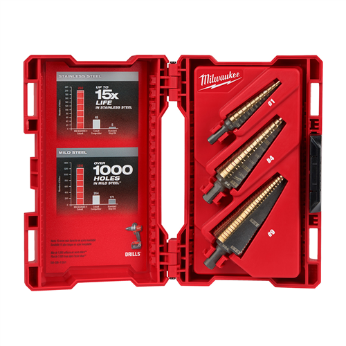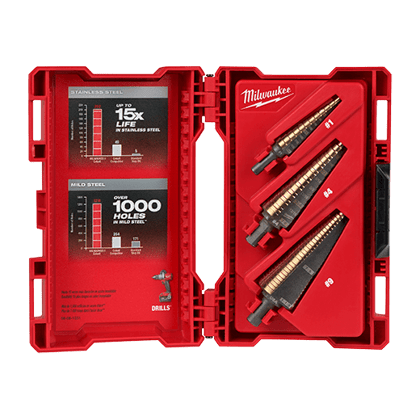 Milwaukee 48-89-9291 Step Bit Kit includes step drill bit #1 (1/8"-1/2"), step drill bit #4 (3/16"-7/8") and step drill bit #9 (7/8"-1 1/8"). Designed with elongated dual flute, rapid strike tip, laser engraving and 3 flat secure grip shanks. Bits are made out of cobalt.