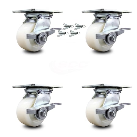 Heavy Duty Large Top Plate Nylon Swivel Caster Set of 4 w/4" x 2" White Wheels - Includes 4 Swivel w/Side Lck Brakes & Bolt on Swivel Locks - 3200 lbs Total Capacity - Service Caster Brand
