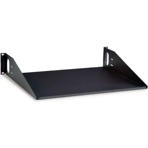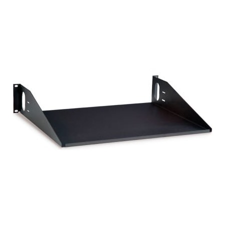 2U 14.75" Economy Rack Shelf Features Two-Point Mounting Cantilever or two-point rack shelf is perfect for use in two-post racks, wall mount racks, and cabinets. Easy to Install Each U space features four mounting holes. These mounting holes can be mounted with rack screws (and cage nuts if needed) to easily install in tapped or cage nut style mounting rails. Rounded Corners Rounded corners reduce the risk of damage to your devices, cabling, and/or hands. Specifications Part Number 3000-1-003-02 Width 19" Depth 14.75" Height 3.47" Weight 5.85 lbs. Shipping Dimensions 21" L x 18" W x 5" H Material(s) CRS (Cold Rolled Steel) Color/Finish Black Powder Coated Finish UPC 879447000948 Warranty 5-Year Limited Warranty What’s In the Box? Qty 1 - 2U 14.75" Economy Rack Shelf