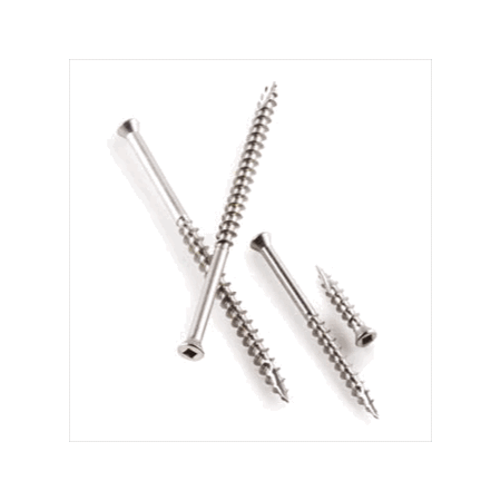 7 x 2 Simpson Trim-Head Wood Decking Screws - Square Drive 305 SS - Bulk Pail (5000) - The type 17 tip provides fast starting and resists splitting in hardwood. Coarse threads run approximately 2/3 up the shank to draw the decking tightly to the substrate. Pre-drilling is recommended near board ends to prevent splitting. #1 Square Drive - All #7 diameters and 9 x 3 1/2. #2 Square Drive - 9 x 4