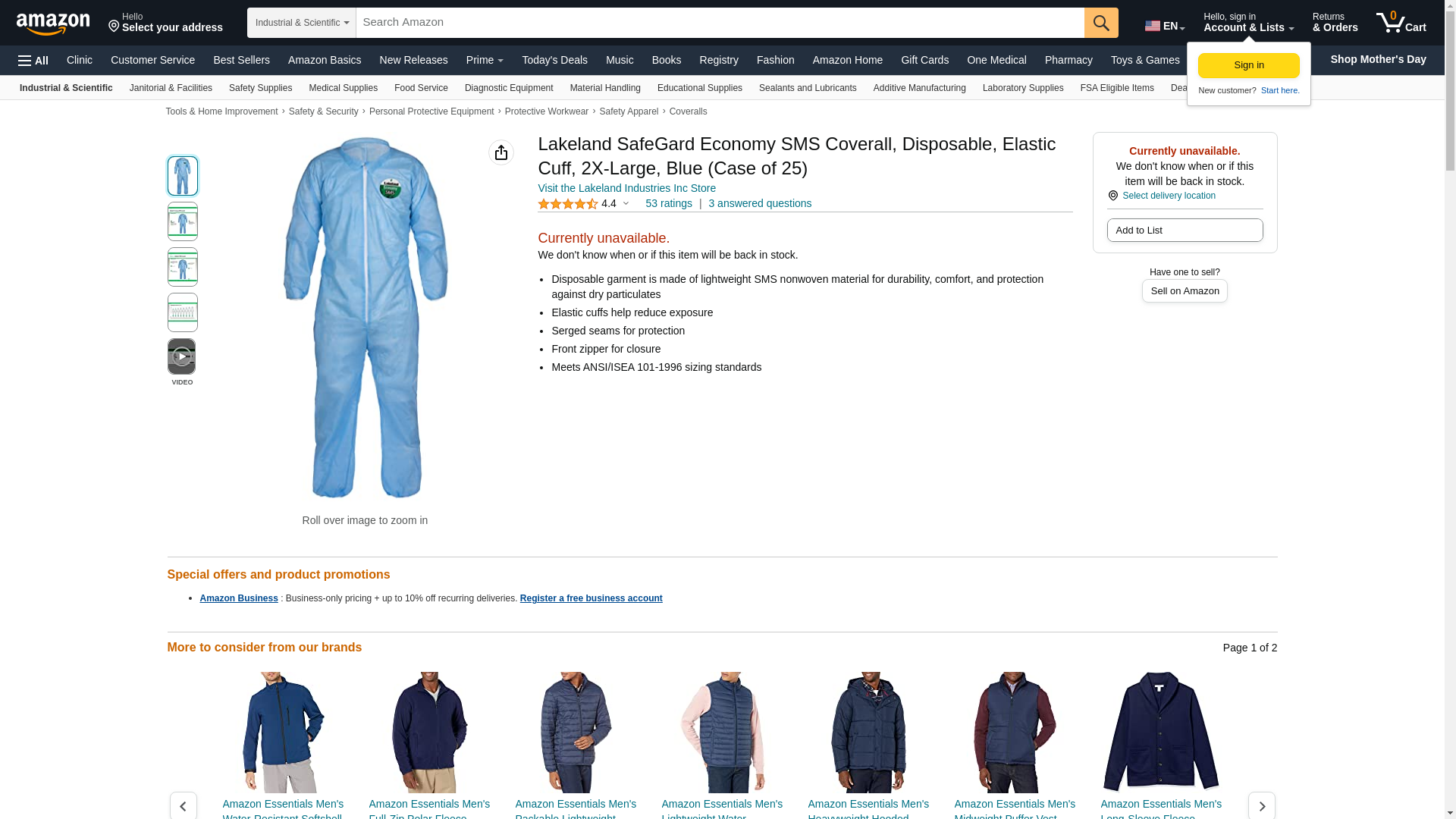 Lakeland SafeGard Economy SMS Coverall, Disposable, Elastic Cuff, 2X-Large, Blue (Case of 25)