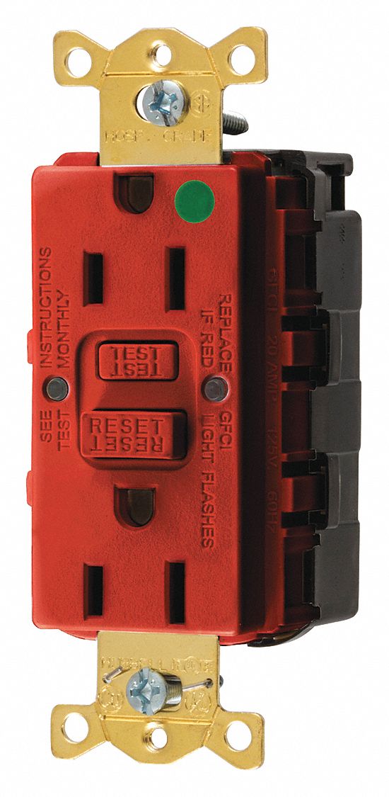 - <b>Price For:</b> Each <b>Outlet Type - Plugs and Receptacles</b>: Decorator Duplex <b>NEMA Configuration</b>: 5-15R <b>Application Environment</b>: Heavy Use Hospital Grade <b>Weather Resistant</b>: No <b>Color</b>: Red <b>Item - Plugs and Receptacles</b>: Receptacle <b>Item</b>: GFCI Receptacle <b>Special Features</b>: Ground Fault Indicator <b>Voltage</b>: 125VAC <b>Voltage - Plugs and Receptacles</b>: 125VAC <b>Number of Poles</b>: 2 <b>Surge Suppression</b>: No