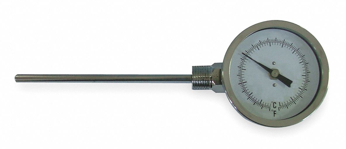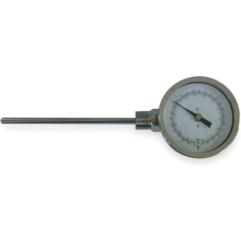 | Feature | <b>Price For:</b> Each <b>Accuracy</b>: +/-1% <b>Window Material</b>: Glass <b>Case</b>: Hermetically Sealed <b>Case Material</b>: Stainless Steel <b>Sensing Element</b>: Bimetal <b>Item</b>: Side Reading Dial Thermometer <b>Connection Size</b>: 1/2" NPT <b>Connection Location</b>: Left Side <b>Dial Size</b>: 3" <b>Manufacturers Warranty Length</b>: 1 yr. <b>Stem Material</b>: Stainless Steel <b>Stem Dia.</b>: 1/4" <b>Stem Length</b>: 2-1/2" |