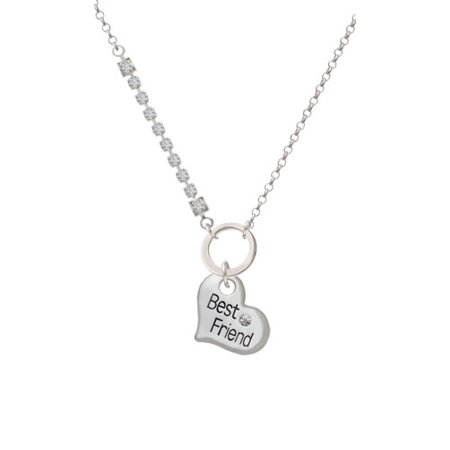 Silver Tone Large ''Best Friend'' Heart with Clear Crystal Divine Karma Necklace. Best Friend Heart is approximately 0.76 x 0.65 x 0.11 inches (HxWxD) not including loop. Word is antiqued on the front with an AB crystal. Back has an antiqued flower. 2 mm Rolo Chain Necklace is 18 inches long including 1.50 inch crystal strand. Lobster Claw Clasp. Karma Ring is approx. .50 x .50 x 0.5 inches (HxWxD). The crystals in this necklace represent star alignment. It is said that when the stars align an unexpected or nearly impossible event takes place. Some believe it is pure luck, divine intervention of God, or celestial guiding forces. The Karma Ring or Eternity Circle is believed to clear your mind of negative thoughts and inject positive energy to you and those around you. We are a family owned company in the U.S.A. since 1977. PLEASE NOTE: Our products are lead safe, but are not intended for children 14 years and younger.