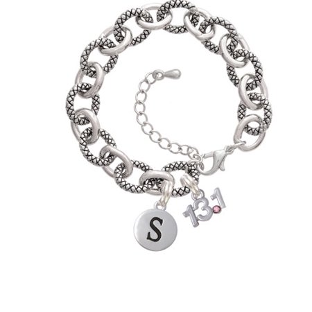 Half Marathon - 13.1 with Pink Crystal -S- Pebble Initial Diana Bracelet. Charm. Alternating Textured & Smooth Link Bracelet is 7.25 Inches with a 1.25 Inch Extender. Bracelet Links are 0.5 x 0.4 Inches (LxW). Lobster Claw Clasp. Pebble Disc Initial is approx. 0.59 x 0.50 x 0.09 inches (HxWxD) including loop. Available in A-Z and &. Featured item is an exclusive Delight & Co. design. We are a family owned company for over 35 years in the U.S.A. PLEASE NOTE: Our products are lead safe, but are not intended for children 14 years and younger.