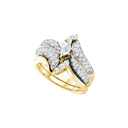 <p><span style="font-size:16px;"><b><u>Description</u></b><br /></span></p> <p><span style="font-size: 14px;">14kt Yellow Gold Womens Marquise Diamond Bridal Wedding Engagement Ring Band Set 1.00 Cttw</span></p> <br /> <p><span style="font-size:16px"><u><b>Gemstone Details</b></u></span></p> <p><span style="font-size:14px">1.00 Carats total weight --- 1/4 carat center solitaire<br /><br />All diamonds are natural and conflict-free in origin<br /><br /></span></p> <ul type="square"> <b>Marquise Center Diamond</b> <br /> <li>1/4 ct.t.w.</li> <li>SI3 clarity</li> <li>H color</li> <li>6-prong setting</li> </ul> <br /> <ul> <b>Round Diamond</b> <br /> <li>3/4 ct.t.w.</li> <li>I1 clarity</li> <li>H-I color</li> <li>Pave setting</li> </ul> <br /> <p><span style="font-size:16px"><u><b>Specifications</b></u><br /></span></p> <p><span style="font-size:14px">14kt Yellow Gold<br />Widest point width: 16 mm (.63 inches )<br />Width of shank: 2.5 mm<br />7.98 grams (approximately)<br />Ring size selectable</span></p> <p><span style="font-size:11px">Combined diamond weight of 1.00 carats total weight represents a range of 0.95 - 1.05 cts. t.w.</span></p>