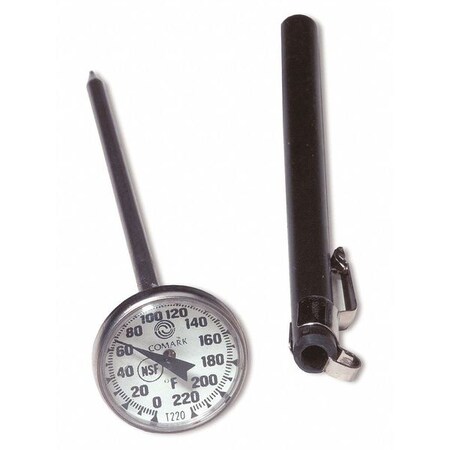 Comark Pocket Thermometer w/ 1" Dial This dial thermometer has a stainless steel stem and watertight plastic lens, and features Comark's patented calibration nut that lets you adjust the thermometer in seconds with just your fingers. The dial cover also magnifies to make it easier to read. Stem Length: 5" Diameter: 1" Temperature Range: 0°F to 220°F Divisions: 2°F Stem Material: S/S Face Material: Plastic Magnifying Dial Cover NSF Certified Individually Boxed Model #: T220A/BOXED 113170