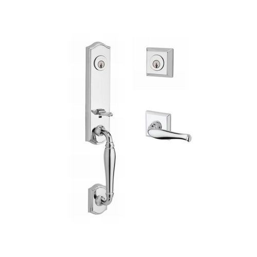 Baldwin Reserve DCNEWXDECRTSR260THK Double Cylinder New Hampshire Handleset with Right Hand Decorative Lever and Traditional Square Rose For Thick Door with 6AL Latch and Dual Strike Bright Chrome Finish