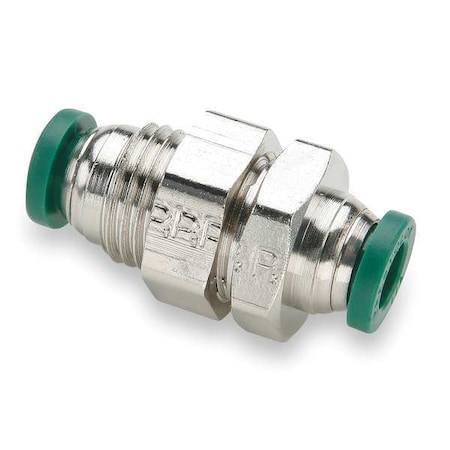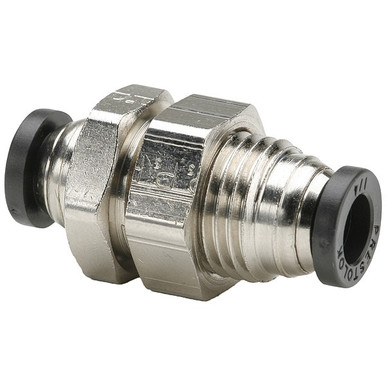 Prestolok Nickel-Plated Brass Push-To-Connect Fittings Max. operating pressure: 300 psi Max. operating temp.: 0° to 200°F (depending on tubing used) Pkg. qty.: 10 Designed for low-pressure circuits where fast assembly, disassembly, and reassembly are important. Compact, 1-pc., nickel-plated brass fittings are for use with polyethylene, nylon, or polyurethane tubing. Support ferrules or I.D. tube supports only required for thin-walled poly tubing. Vacuum applications depend on temperature and tubing type. WARNING: For use only with air, water, oil, and nonreactive gases. Do not use where accidental separation of tube and fitting could cause injury. Not recommended for continuous-pressure cycling applications. This listing is for pkg. of 10. Technical Specification Item Bulkhead Union Tube Fitting Material Nickel Plated Brass Fitting Connection Type Tube Tube Size 5/16 in Max. Pressure 300 psi Temp. Range 0 Degrees to 200 Degrees F Hex Size 3/4 in