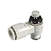 | Feature | <b>Price For:</b> Each <b>Temp. Range</b>: 23 Degrees to 140 Degrees F <b>Adjustment</b>: Screw <b>Item</b>: Speed Control Valve <b>Standards</b>: - <b>Pressure Range</b>: 14.5 to 145 psi <b>Style</b>: Elbow <b>Connection</b>: BSPT x Tube <b>Body Size</b>: 1/4" <b>Tube Size</b>: 8mm <b>Pipe Size</b>: 1/4" <b>Flow</b>: In <b>Body Material</b>: Electroless Nickel-Plated Brass and PBT <b>Country of Origin (subject to change)</b>: Japan |