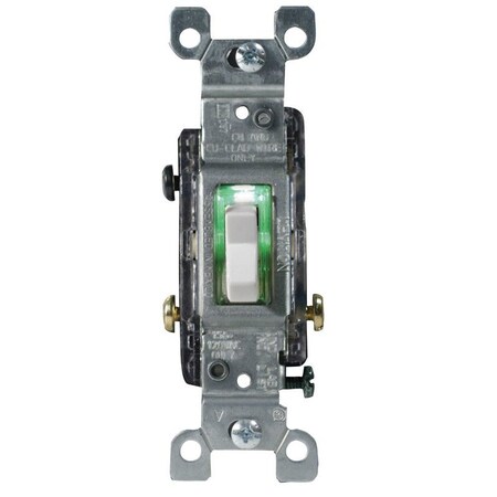 * Residential grade* AC quiet switch* Toggle lighted handle* Grounding* Illuminated Off 3-way* Quickwire push-in and side wired* Polycarbonate actuator material* Thermoplastic body material* Steel strap material* UL and CSA Standards and Certifications* 10 year limited warranty* White* 1/2 HP * 15 amp* 12 maximum amp* 120 volt* Carded