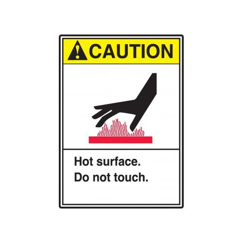 | Feature | Accuform MRQM602VS ANSI Chemicals & Hazmat CAUTION HOT SURFACE DO NOT TOUCH (W/GRAPHIC) 10" x 7" Adhesive Vinyl |