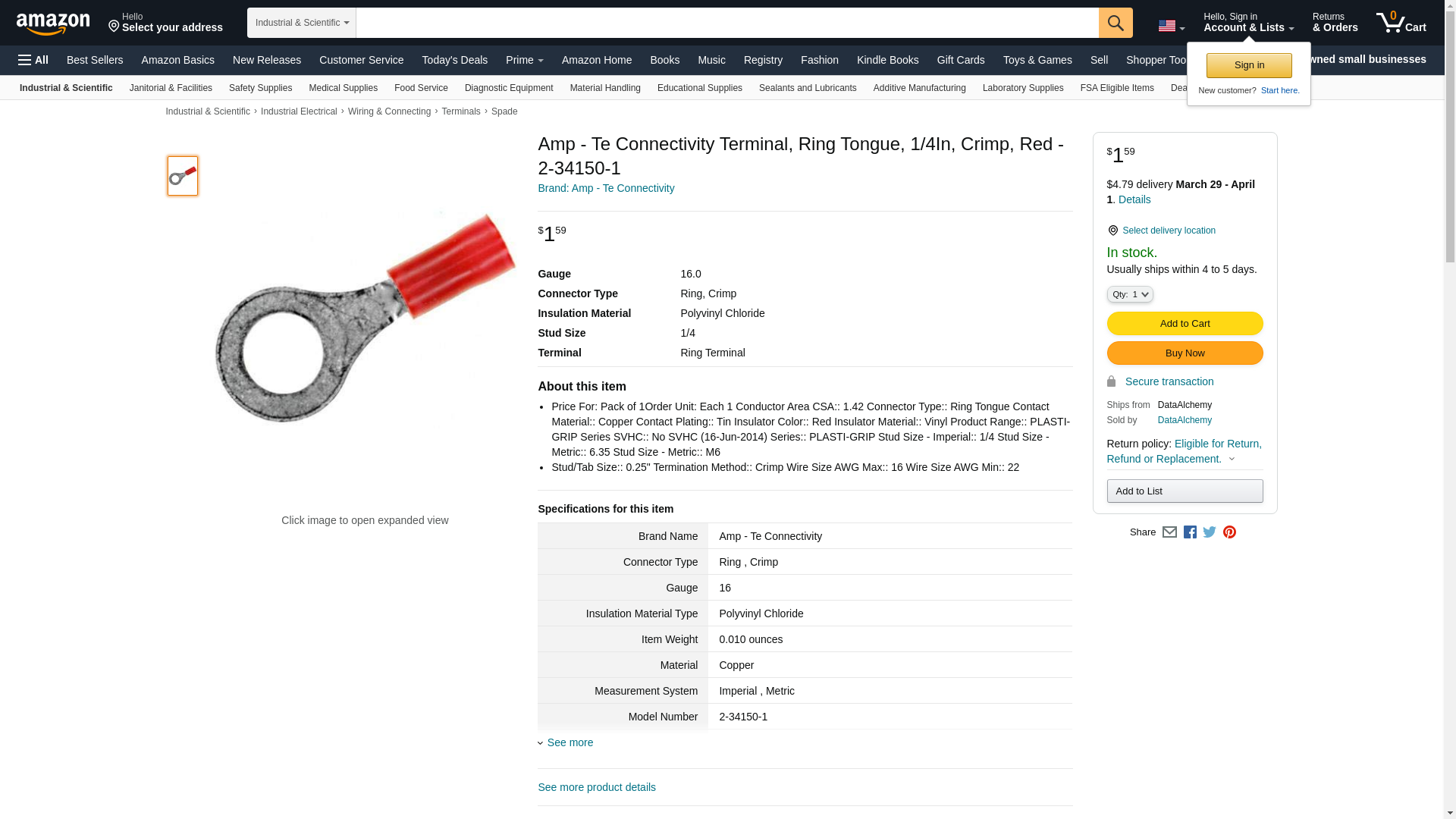 Te Connectivity / Amp 2-34150-1 Terminal, Ring Tongue, 1/4In, Crimp, Red