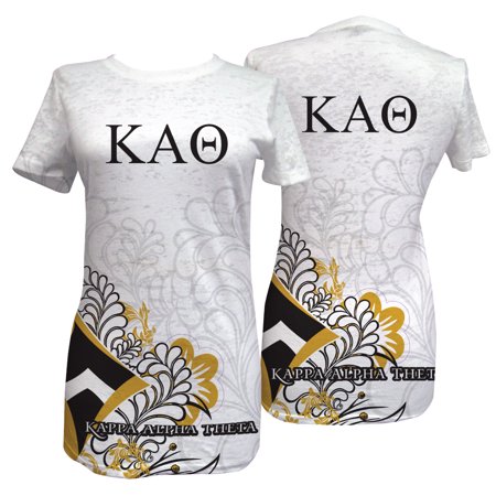 This woman's burnout tee is a great way to show your love for Kappa Alpha Theta. This comfortable soft burnout tee features our seam to seam all over print. **Each shirt is uniquely printed, so no one shirt is exactly alike. Small wrinkles near the shoulders, armpit, or seams may be formed during the printing process. This adds to the vintage look and uniqueness of the item. Size tends to be pretty true to all fitted woman's fashion tee's.