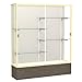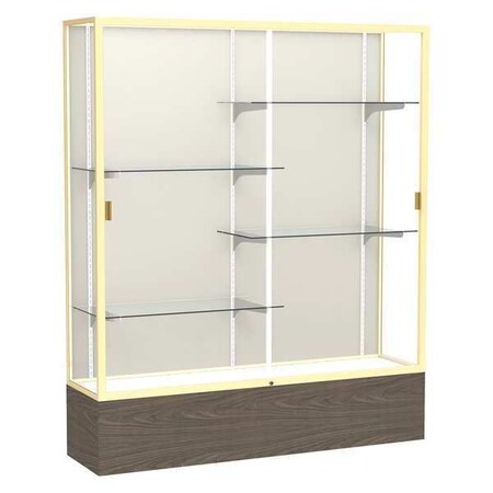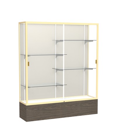 2075PB-GD-WV Backing: Plaque Fabric, Frame Finish: Gold, Vinyl Finish: Walnut Features: -Anodized aluminum framing. -Sliding tempered glass doors for safety and easy access to contents. -Wood grain vinyl base. -Reflective mirror back adds luster and class. -Adjustable levelers for stability on uneven floors. -Reliant Series collection. Product Type: -Trophy display case. Style: -Floor standing. Display Material: -Glass. Country of Manufacture: -United States. Frame Material: -Metal. Adjustable Shelves: -Yes. Dimensions: Overall Height - Top to Bottom: -72". Overall Width - Side to Side: -60". Overall Depth - Front to Back: -16". Overall Product Weight: -457 lbs.