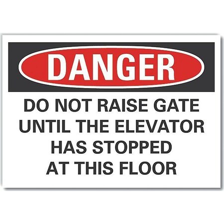 Elevator Hazard Danger Label, Vertical Rectangle, Number of Printed Sides 1, English, Sign Format Traditional OSHA, Sign Legend Do Not Raise Gate Until The Elevator Has Stopped At This Floor, Sign Legend Background Color White, Sign Legend Style Text