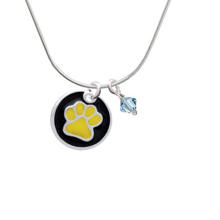 Silver Tone 3/4" Hot Yellow Paw in Black Circle - Hot Blue Bicone Crystal Necklace. Two Sided Silver Tone Charm. Charm size is approx. 0.75 x 0.75 x 0.16 inches (HxWxD) including loop. 18 Inch Snake Chain Necklace with a Lobster Claw Clasp. Hand wrapped crystal bicone is approx: 6mm. We use Swarovski Crystallized Elements. Available in many colors. We are a family owned company in the U.S.A. since 1977. PLEASE NOTE: Our products are lead safe, but are not intended for children 14 years and younger.