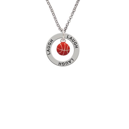 Silver Tone Mini Enamel Basketball Laugh Affirmation Ring Necklace. Silver Tone, hand enameled charms. Charm size is approx. 0.46 x 0.34 x 0.14 inches (HxWxD) including loop. Silver tone 2mm Belcher Chain Necklace is approx. 24 Inches with a Lobster Claw Clasp. Affirmation Ring is approx. 0.86 x 0.86 x 0.05 (HxWxD). This inspirational piece of jewelry is very meaningful. Its circular shape is symbolic for endless belief in the message that is imprinted around the ring. These are motivational or sentimental messages to the wearer. Makes a great gift! PLEASE NOTE: Our products are lead safe, but are not intended for children 14 years and younger.