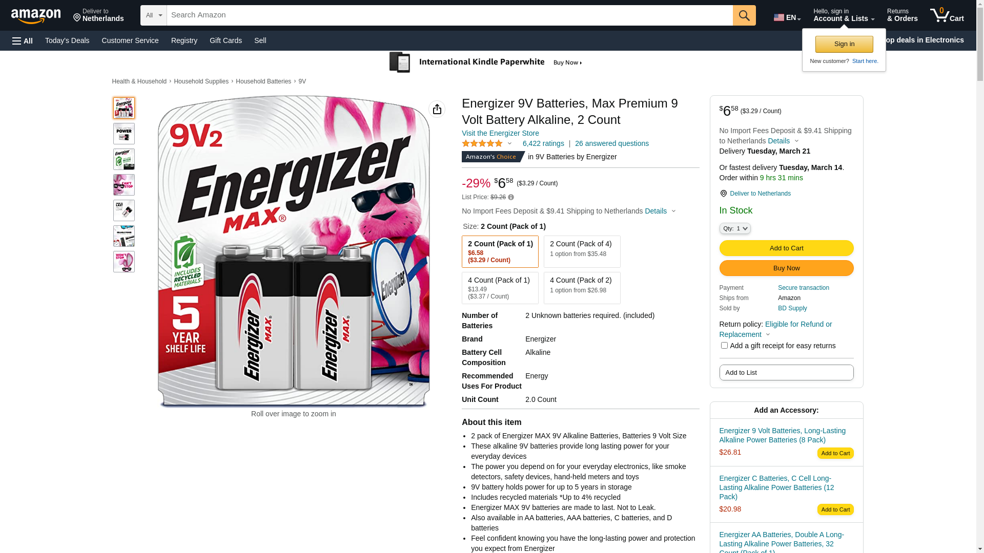 | Feature | 2-pack of Energizer MAX alkaline 9V batteries |