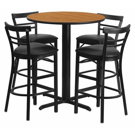 Flash Furniture Carlton 24'' Round Natural Laminate Table Set with X-Base and 4 Two-Slat Ladder Back Metal Barstools - Black Vinyl Seat