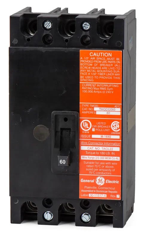 Mfr Brand Name: GE / Catalog No.: TMQD32060 / Product Name: GE TMQD32060 N 60A 240V 3P 100K NEW / Amps: 60 / Volts: 240 / Poles: 3 / AIC Rating: 100