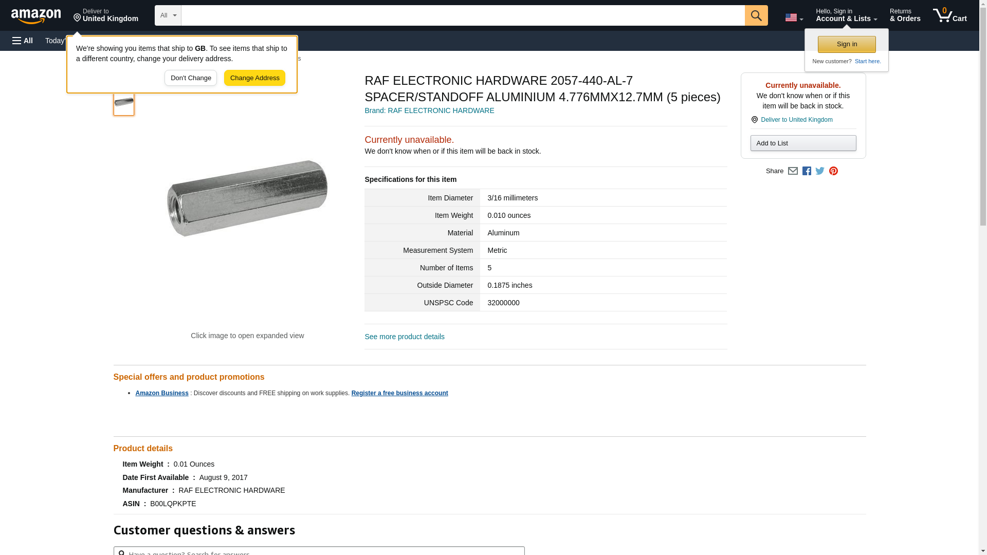 RAF ELECTRONIC HARDWARE 2057-440-AL-7 SPACER/STANDOFF ALUMINIUM 4.776MMX12.7MM (10 pieces)