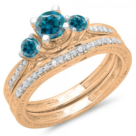 When you ask for a lifetime commitment present her with a ring as beautiful and unique as she is! Stunning in 14K Rose Gold this three stone engagement ring features a precious 0.50 ct. big blue diamond center stone that catches the eye. Two smaller round blue diamonds while additional round diamonds line the shank. Intricate millgrain detailing gives the ring unexpected depth and charm. Don't miss out on this piece of jewelry; it is an opportunity of a lifetime!